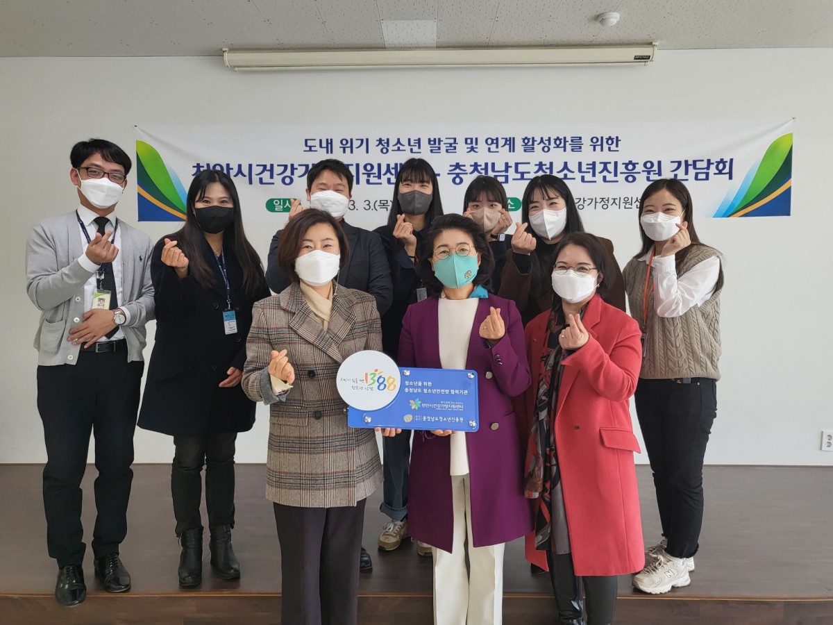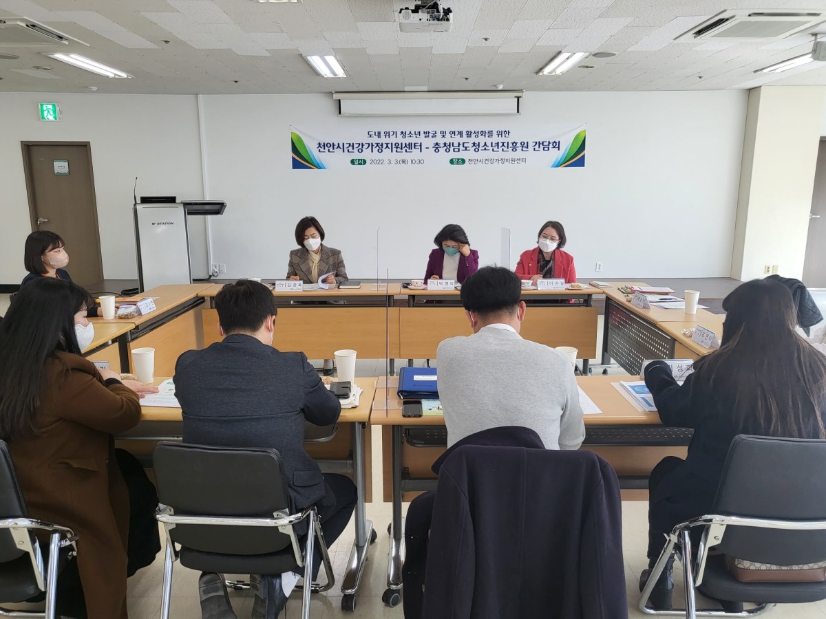 충청남도청소년진흥원-천안시건강가정지원센터 간담회 1039 | 상담홍보담당자 | 2022-05-06 충청남도청소년진흥원-천안시건강가정지원센터 간담회 3월3일(목), 따뜻한 봄기운과 함께 천안시건강가정지원센터와 위기 청소년 발굴 및 연계 활성화를 위한 간담회를 개최하였습니다. 두 기관은 본 간담회를 통해 건강한 가정환경이 청소년의 건강한 성장에 영향을 줄 수 있음을 함께 공감하고 더 나아가 앞으로 사업 발전 방안들에 대해 논의하는 시간이었습니다. 청소년안전망 협력기관으로 10여년 함께 해온 천안시건강가정지원센터! 앞으로 더 기대해주세요!