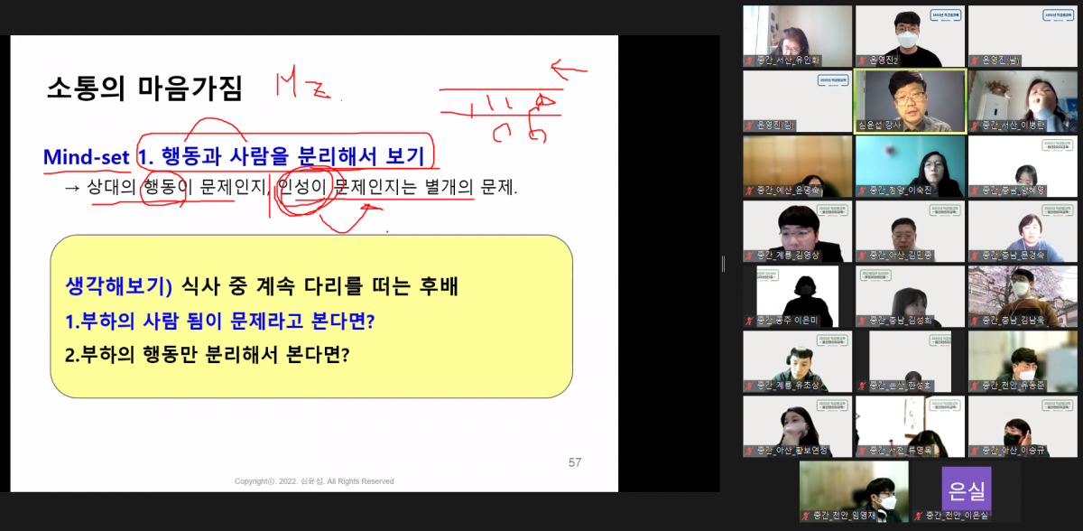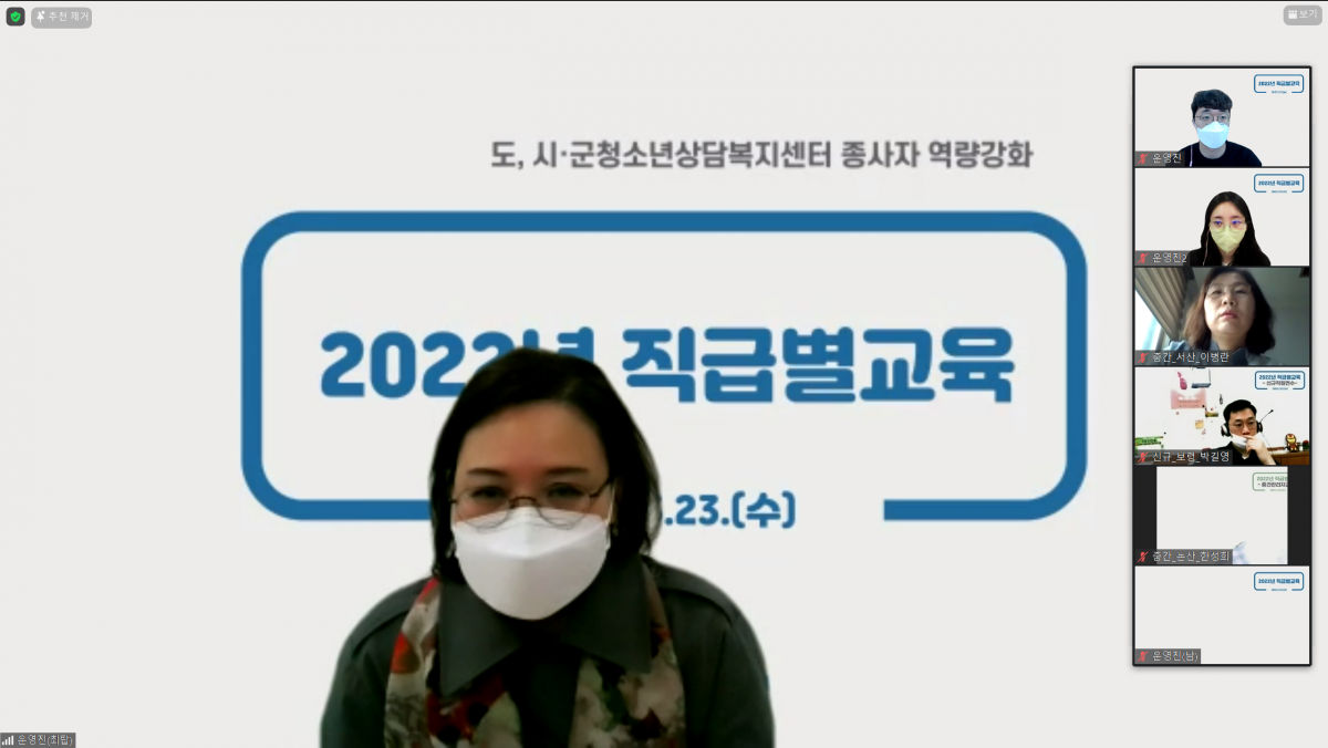 도, 시·군청소년상담복지센터 종사자 역량강화 직급별 교육 1591 | 상담홍보담당자 | 2022-05-06 3월 23일(수)부터 24일(목)까지 도내 청소년상담복지센터 및 학교밖청소년지원센터 종사자(신규직원, 중간관리자, 기관장)를 대상으로 2022년 직급별 교육이 진행되었습니다.직급별 교육은 각 대상별 직무역량을 향상시킬 수 있는 교육으로 구성되었습니다. 교육을 통해 각자의 자리에서 한걸음 더 나아갈 수 있기를 바랍니다! - 신규직원연수: 직장예절, 직무관련교육, 행정실무교육 등- 중간관리자교육: MZ세대 이해 및 팀장 리더십- 기관장워크숍: MZ세대 이해 및 소통 리더십, 조직관리 심화교육, 소진예방 프로그램(영화치료)
