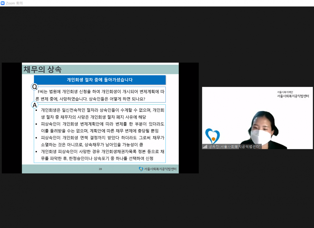 아동‧청소년 빚 대물림 방지 지원 사업설명회 및 상담자 교육 1003 | 상담홍보담당자 | 2022-05-06 빚도 대물림 되는 것을 아시나요? 부모의 사망에 따른 상속으로 빚을 물려받을 위기 상황에 처한 충남에 거주하는 만24세 이하 아동‧청소년 대상으로 법률지원서비스를 시작합니다. 도내 지자체 및 청소년유관기관 실무자들을 모시고 충청남도 아동‧청소년 부모 빚 대물림 방지 지원사업 사업설명회와 상담자교육을 실시하였습니다. 법률지원서비스에 대한 사업소개와 상속관련 법률교육으로 기본적인 상담을 진행할 수 있도록 내용을 구성하였습니다.