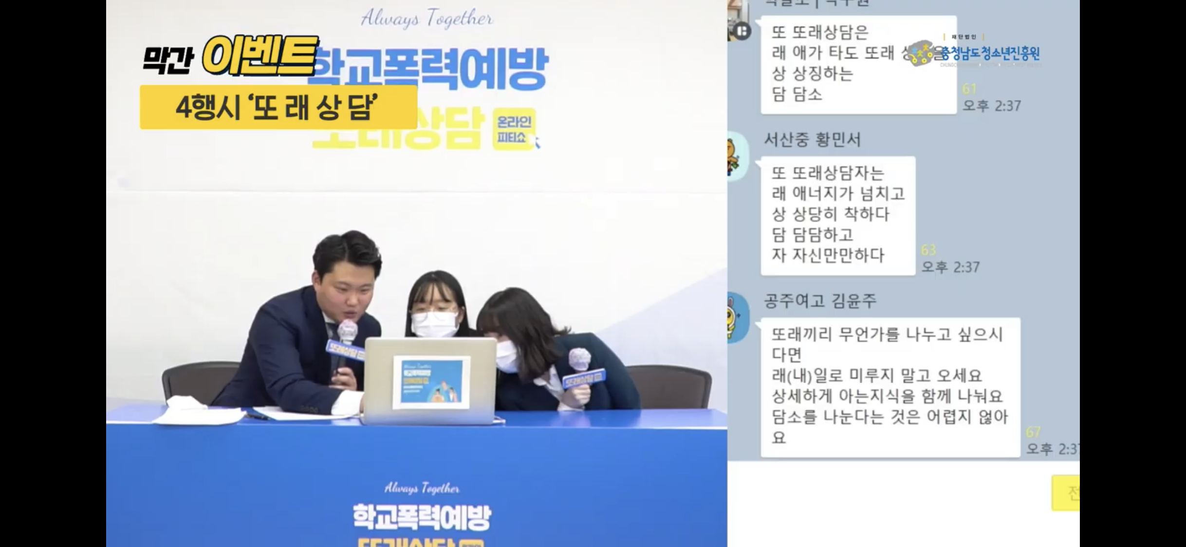 유튜브 라이브 방송을 통해 진행된 피티쇼는 오픈카톡방을 활용하여 100여명의 청소년 및 지도자들과 활발하게 소통하는 참여의 장이 되었습니다. 함께 해준 청소년 및 지도자분들께 감사드리며 또래상담을 응원합니다.