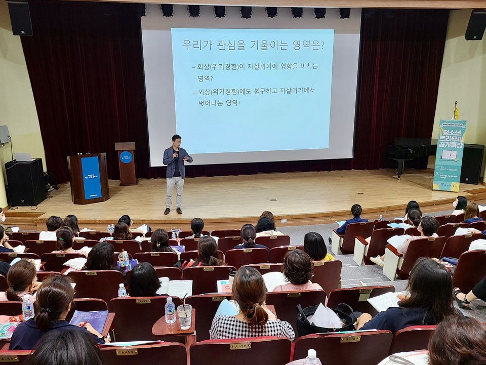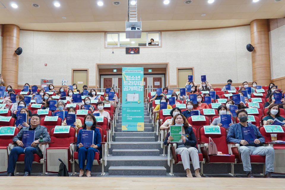 2020년 청소년 트라우마 공개특강 1502 | 최고관리자 | 2020-07-14 2020년 청소년 트라우마 공개특강 -일시: 2020년 7월 10일(금), 13:30~17:30 -장소: 아산시청소년교육문화센터 스마트홀 -대상: 유관기관 종사자, 학부모 및 지역주민 -내용: 청소년 자살자해 트라우마 학부모 및 지도자 대처방법