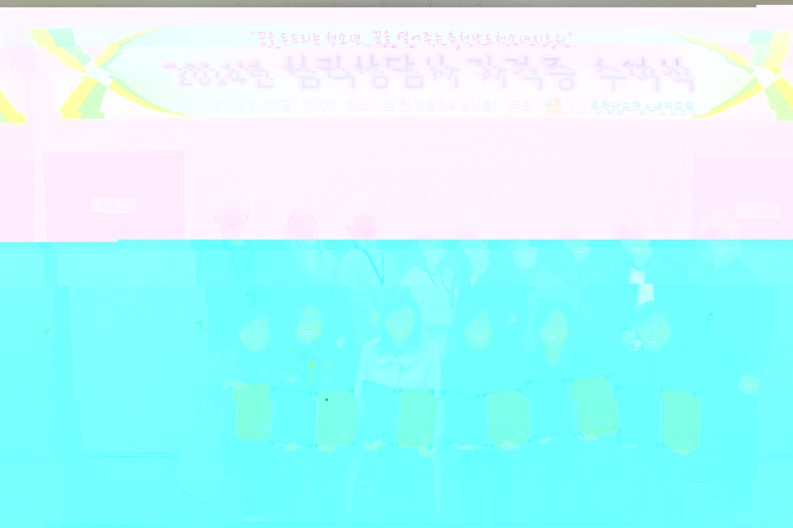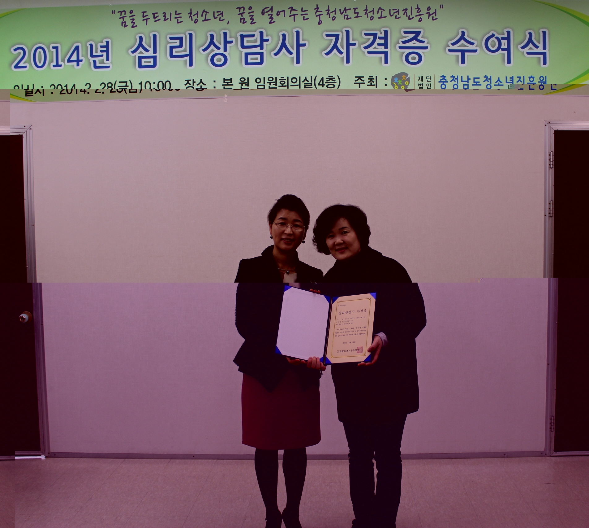 2014년 심리상담사 자격증 수여식 3702 | 최고관리자 | 2014-03-03 2014년 심리상담사 자격증 수여식 일 시 : 2014년 2월 28일(금) 10:00 장 소 : 본 원 임원회의실(4층) 내 용 : 2014년 심리상담사 자격증 수여