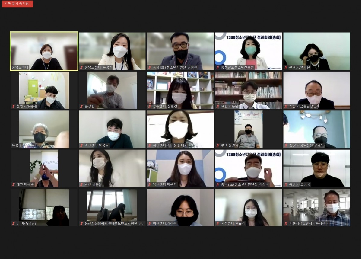 1388청소년지원단 2차 정례회의(총회) 1329 | 상담홍보담당자 | 2022-11-09 9.2.(금), 도, 시·군 1388청소년지원단 2차 정례회의(총회)가 진행되었습니다. 화상회의로 진행된 자리었지만, 얼굴을 뵙는 반가움은 크게 느껴졌어요. 충남도 1388청소년지원단 김상국단장님을 중심으로 지역별 상반기 활동 내용을 공유와 함께, 도 1388청소년지원단 상담·멘토 분야 김종환 단원님 신규 위촉까지 진행되어 풍성한 자리가 되었습니다.충남 청소년의 든든한 울타리, 1388청소년지원단 든든합니다!