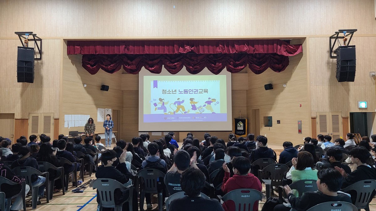 2023년 찾아가는 청소년 노동인권교육 2443 | 상담복지센터 | 2023-06-15 12일 송남중학교, 20일 논산시학교밖청소년지원센터에서 찾아가는 청소년 노동인권교육이 진행되었습니다. 송남중학교에서는 전체학년을 대상으로 논산시학교밖청소년지원센터에서는 학교밖청소년을 대상으로 노동인권 감수성, 청소년을 위한 노동법, 부당처우 대처 방법 등의 교육을 제공하였습니다. 교육을 통해 청소년들이 노동 현장에서 자신의 권리를 지키고, 부당처우 상황에서 대처할 수 있는 정보를 배울 수 있는 시간을 가지는 자리가 되었습니다. 앞으로도 충청남도청소년근로보호센터는 청소년 노동인권교육에 힘쓰도록 하겠습니다.