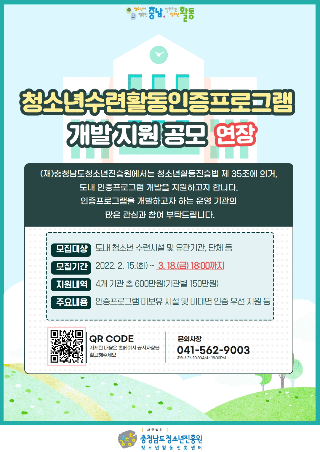 [공고] 청소년수련활동인증프로그램 개발 지원 공모 연장 대상 2022-02-15 분야 300 교육기간 2022-04-01 ~ 2022-12-31 접수기간 2022-02-15 ~ 2022-03-18 장소 OFF 교육비 2022-03-18 정원 300 상태 마감 2022.03.15 20:55 [공문] 청소년수련활동인증프로그램 개발 지원 공모 연장 안내.pdf (68.4K) + 72 2022.03.15 20:55 [붙임] 청소년수련활동인증프로그램 개발 지원 공모 안내.pdf (181.3K) + 77 2022.02.15 19:18 [별첨] 청소년수련활동인증프로그램 개발 지원 신청양식.hwp (989.0K) + 71 목록 상세내용
