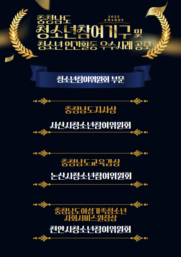 [안내] 2023년 충청남도 청소년참여기구 및 청소년 연간활동 우수사례 공모 선정 결과 안내
