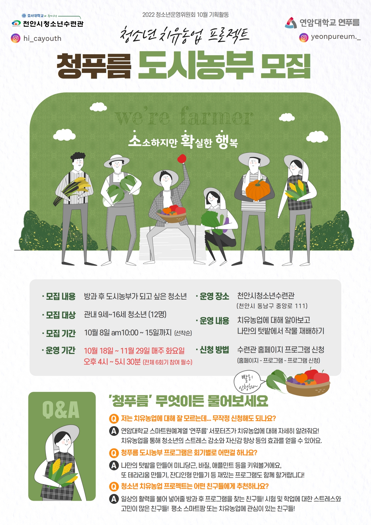 [천안시청소년수련관] 청소년 치유 농업 프로젝트 '청푸름' 도시농부 모집
