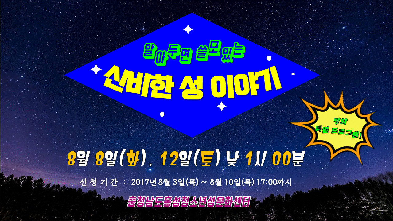 [홍성=뉴스충청인] 충청남도 홍성청소년성문화센터는 오는 8월 8일(화), 12일(토) 오후 방학 특별프로그램 “알.쓸.신.性(알아두면 쓸모있는 신비한 성 이야기)”을 진행한다.