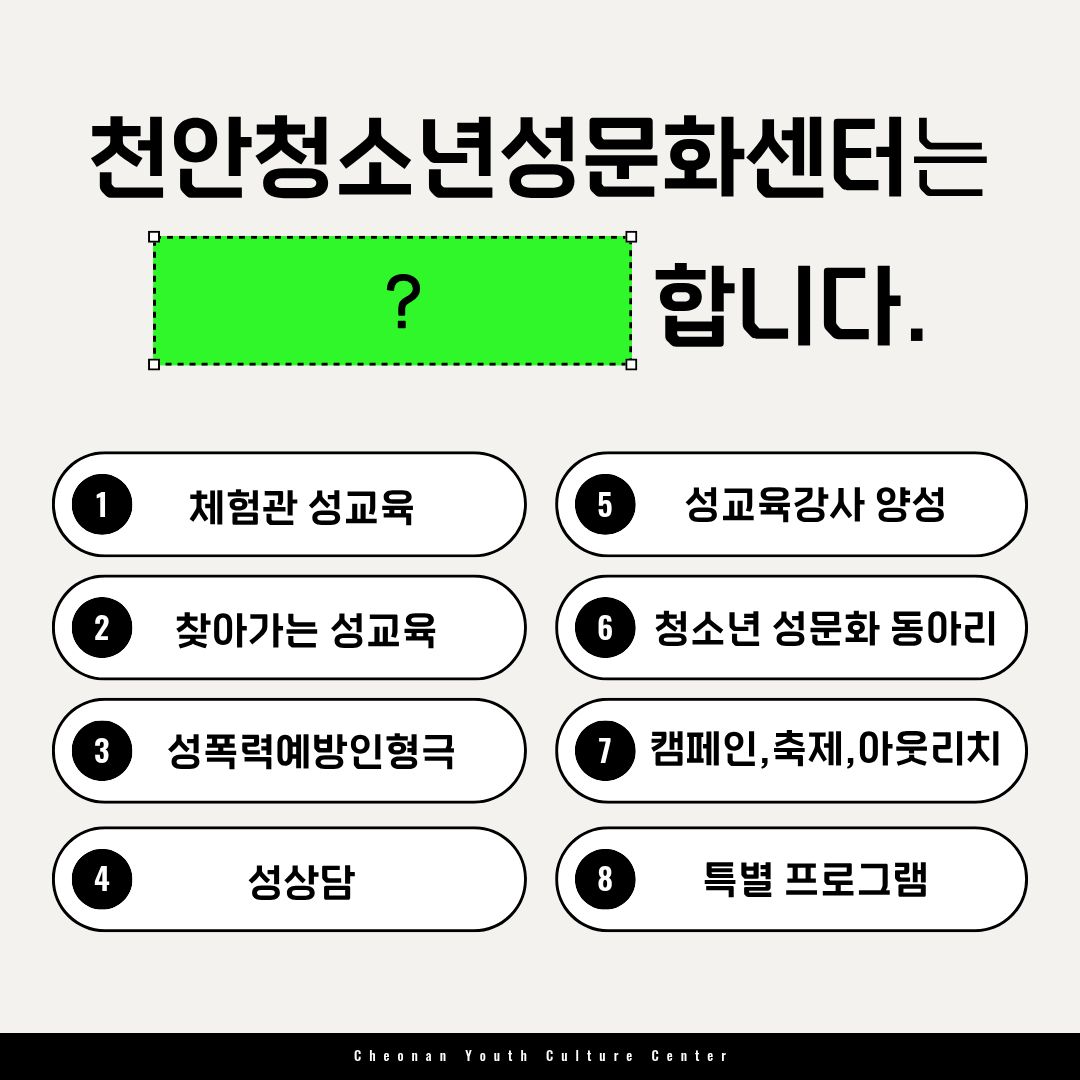 천안시청소년성문화센터 - 아동·청소년 성교육 및 상담 바로가기 메뉴 버튼
