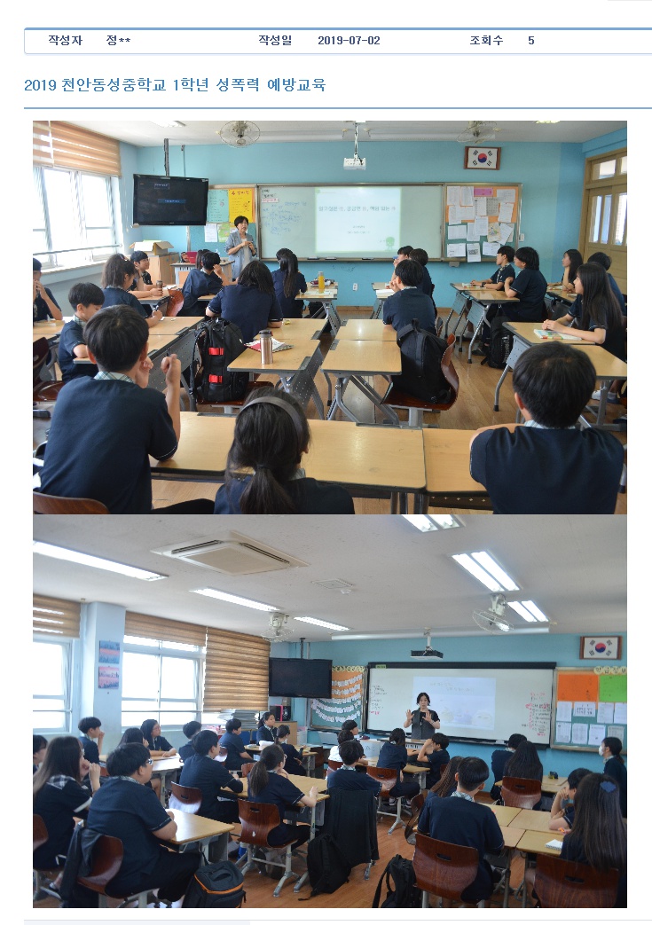 2019년 5월20일 천안 동성중학교 성교육 및 성폭력 예방교육 3043 | 최고관리자 | 2019-07-04 2019.07.04 16:27 동성중학교1학년_성교육.hwp (284.0K) + 64 2019년 5월20일 천안 동성중학교 성교육 및 성폭력 예방교육