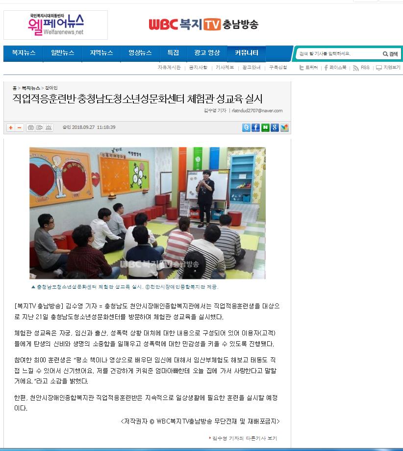 2018년 9월 27일 천안시 장애인 종합복지관-직업적응훈련생대상 체험관성교육(복지뉴스) 2167 | 최고관리자 | 2019-06-04 2018년 9월 27일 천안시 장애인 종합복지관-직업적응훈련생대상 체험관성교육(복지뉴스)