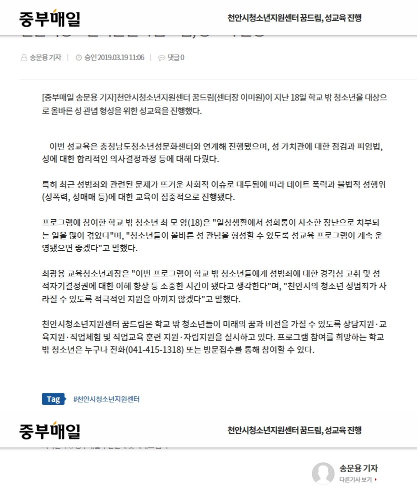2019년 3월18일 천안시 청소년 상담복지센터 꿈드림, 성교육진행 2460 | 최고관리자 | 2019-06-04 2019년 3월18일 천안시 청소년 상담복지센터 꿈드림, 성교육진행