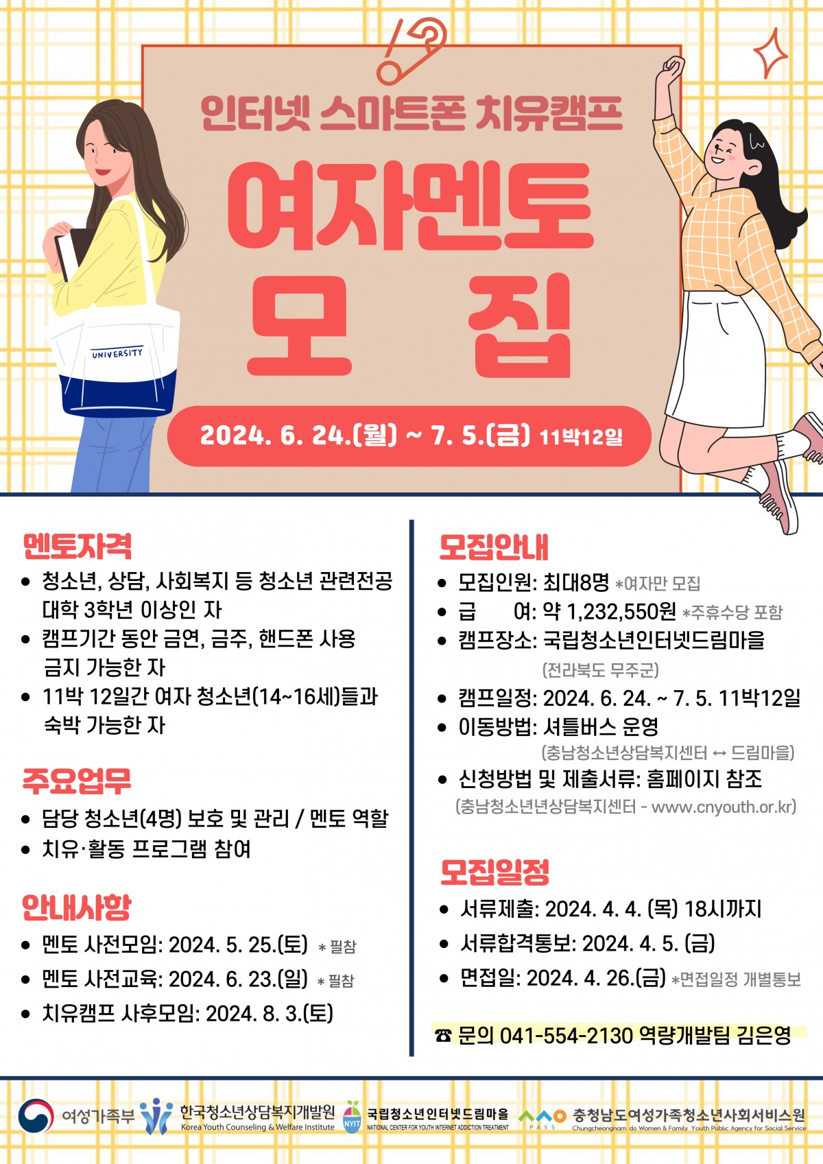 충청남도청소년상담복지센터에서 2024년 청소년 인터넷·스마트폰 치유캠프 멘토를 모집합니다.