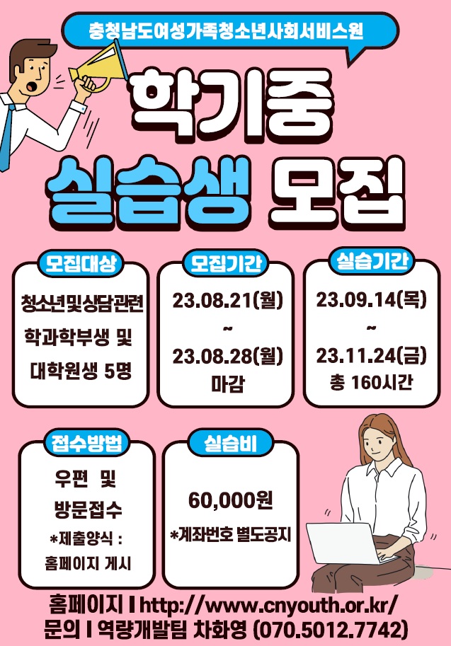 충청남도여성가족청소년사회서비스원 청소년상담복지센터에서 학기중 실습생을 모집합니다. 많은 지원 바랍니다 : )