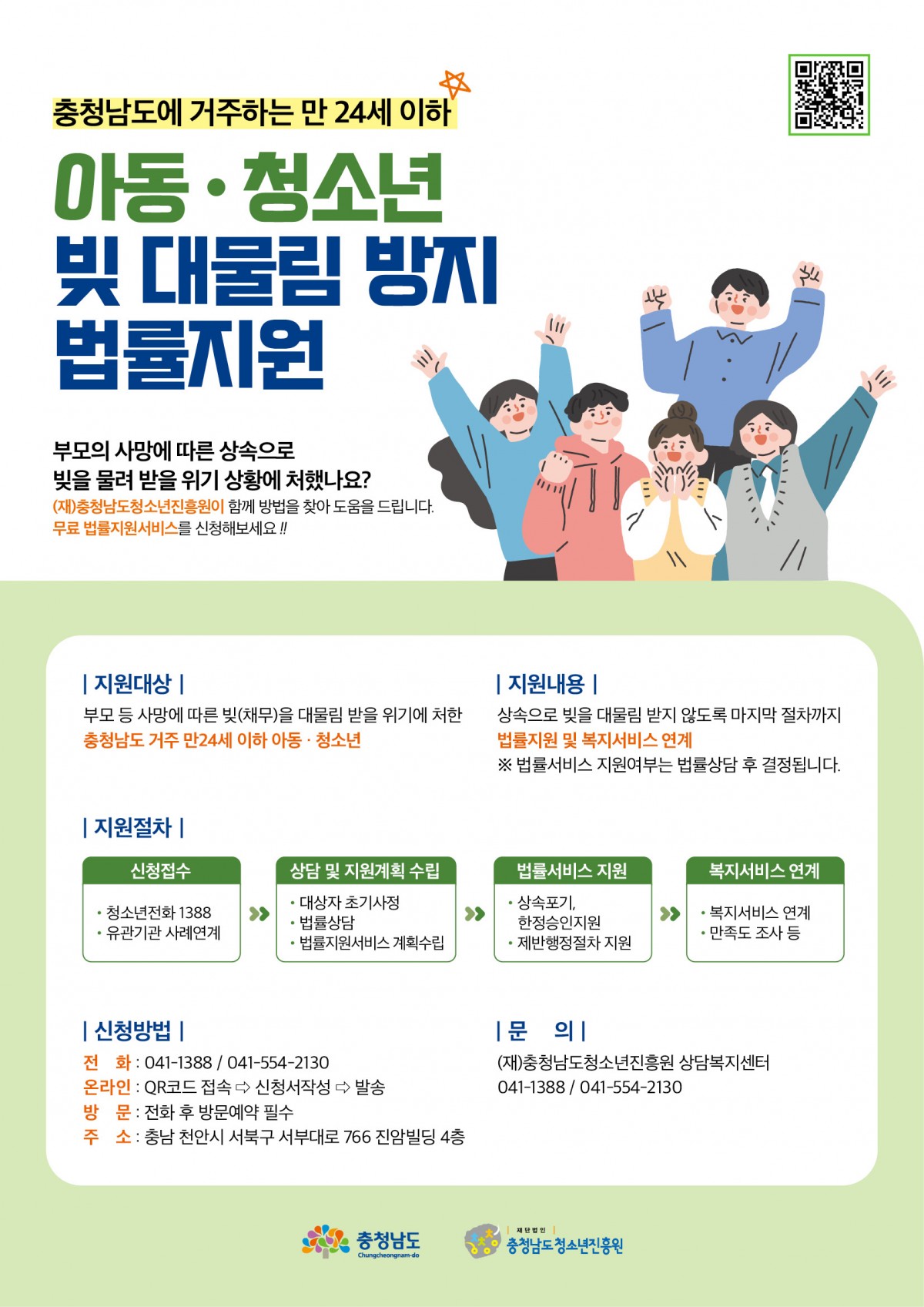 충남도는 (재)충남청소년진흥원과 함께 빚 대물림으로 어려움을 겪고 있는 도내 아동·청소년들에게 무료 법률 상담 등을 지원한다고 21일 밝혔다.