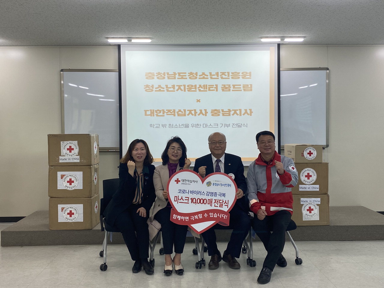 [중부매일 송문용 기자](재)충청남도청소년진흥원(원장 박영의) 청소년지원센터 꿈드림은 지난 14일 대한적십자사 충남지사로부터 코로나19 장기화로 마스크 수급에 어려움을 겪고 있는 학교 밖 청소년을 위한 마스크 1만장을 기부 받았다고 15일 밝혔다.