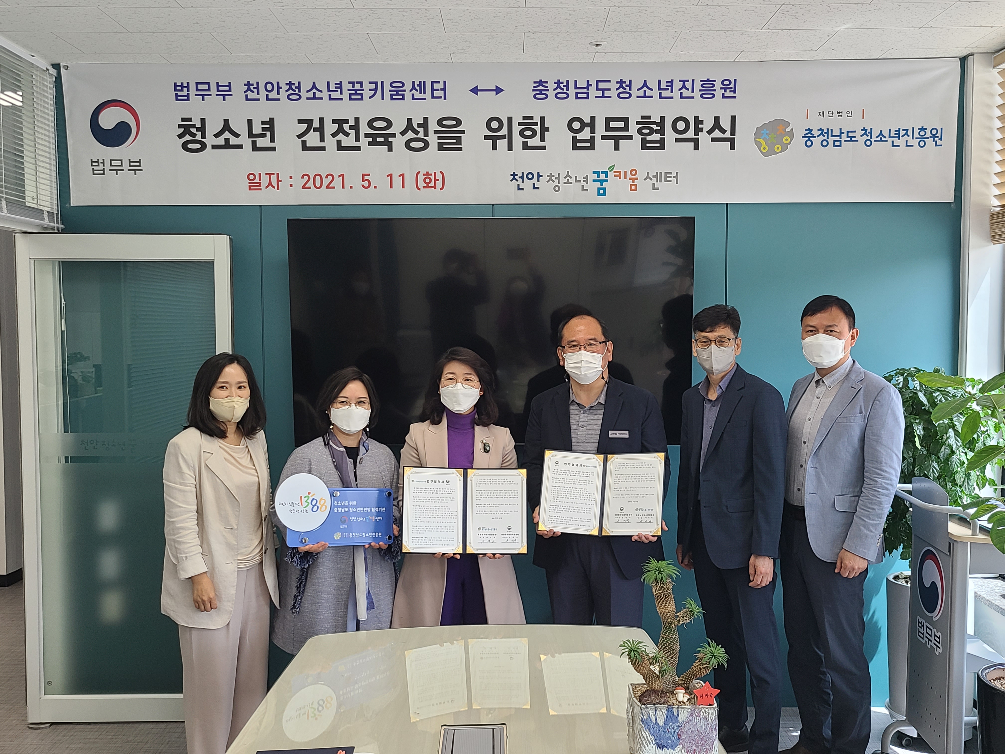 (재)충청남도청소년진흥원(원장 박영의)과 법무부 천안청소년꿈키움센터(센터장 손세국)는 지역 내 청소년 상담, 보호 및 복지 증진을 위해 업무협약을 11일 체결했다.