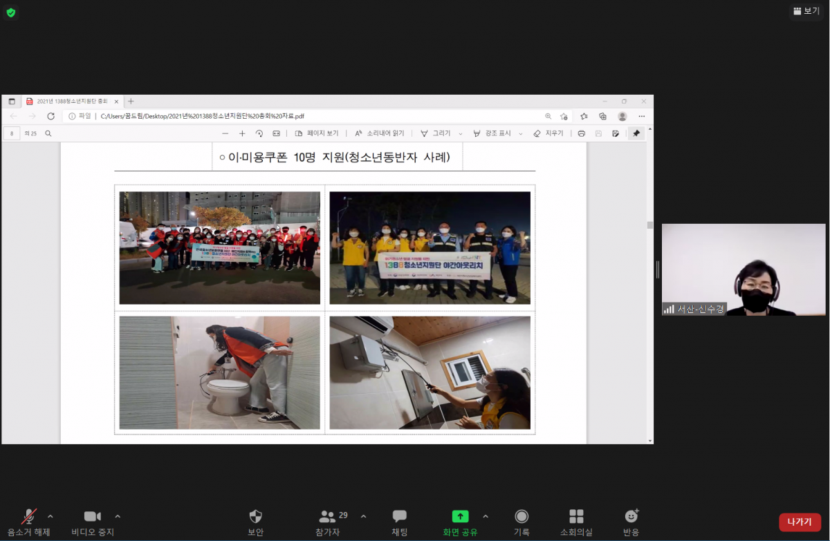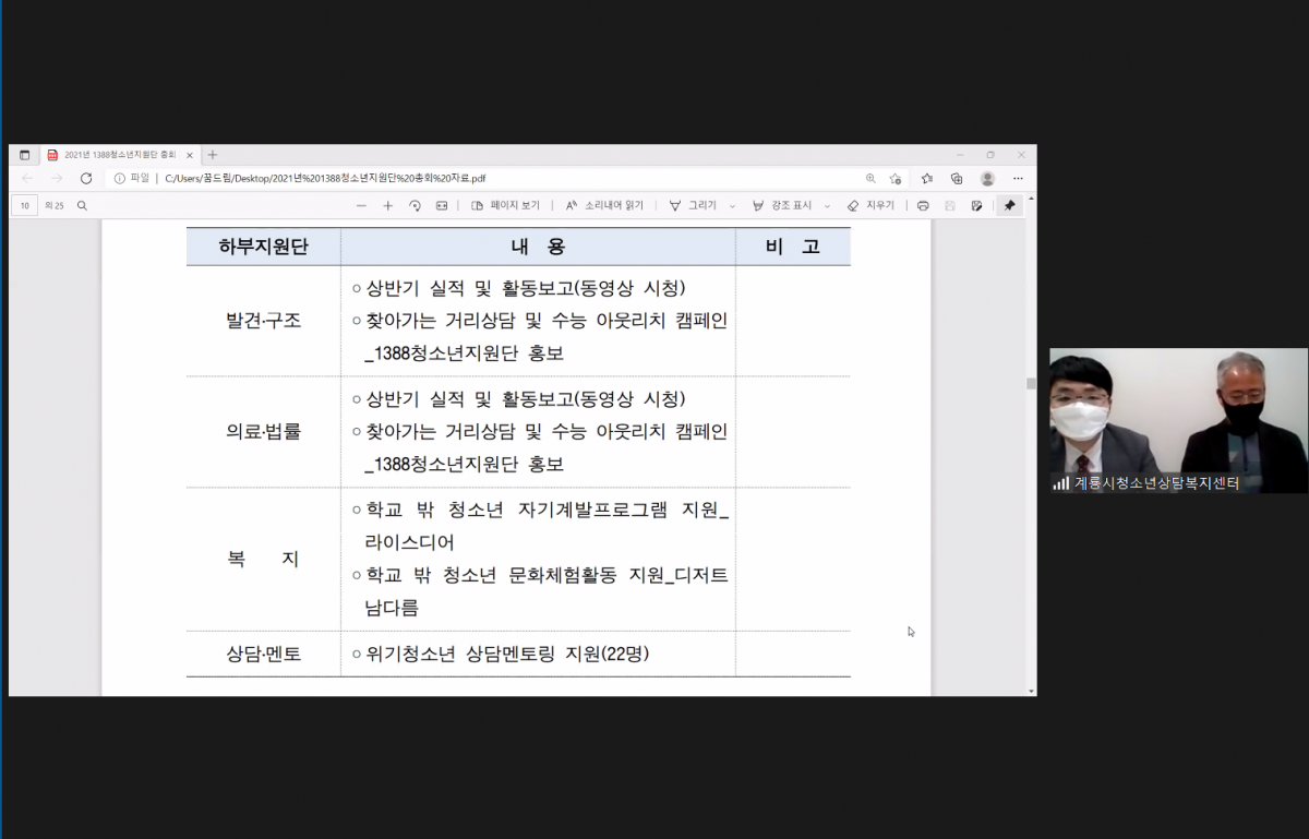 2021년 1388청소년지원단 총회&워크숍 1468 | 상담복지센터 | 2021-11-25 2021년 1388청소년지원단 총회&워크숍이 11월 24일 17시 온라인으로 진행되었습니다.코로나19로인해 비대면으로 진행되어 많은 아쉬움이 남았지만,지역 곳곳에서 따듯한 활동을 이어가고 있는 지원단분들의 소식으로 알찬 시간 되었습니다.내년에는 모두 건강한 모습으로 꼭 얼굴을 보며 함께하고 싶습니다!