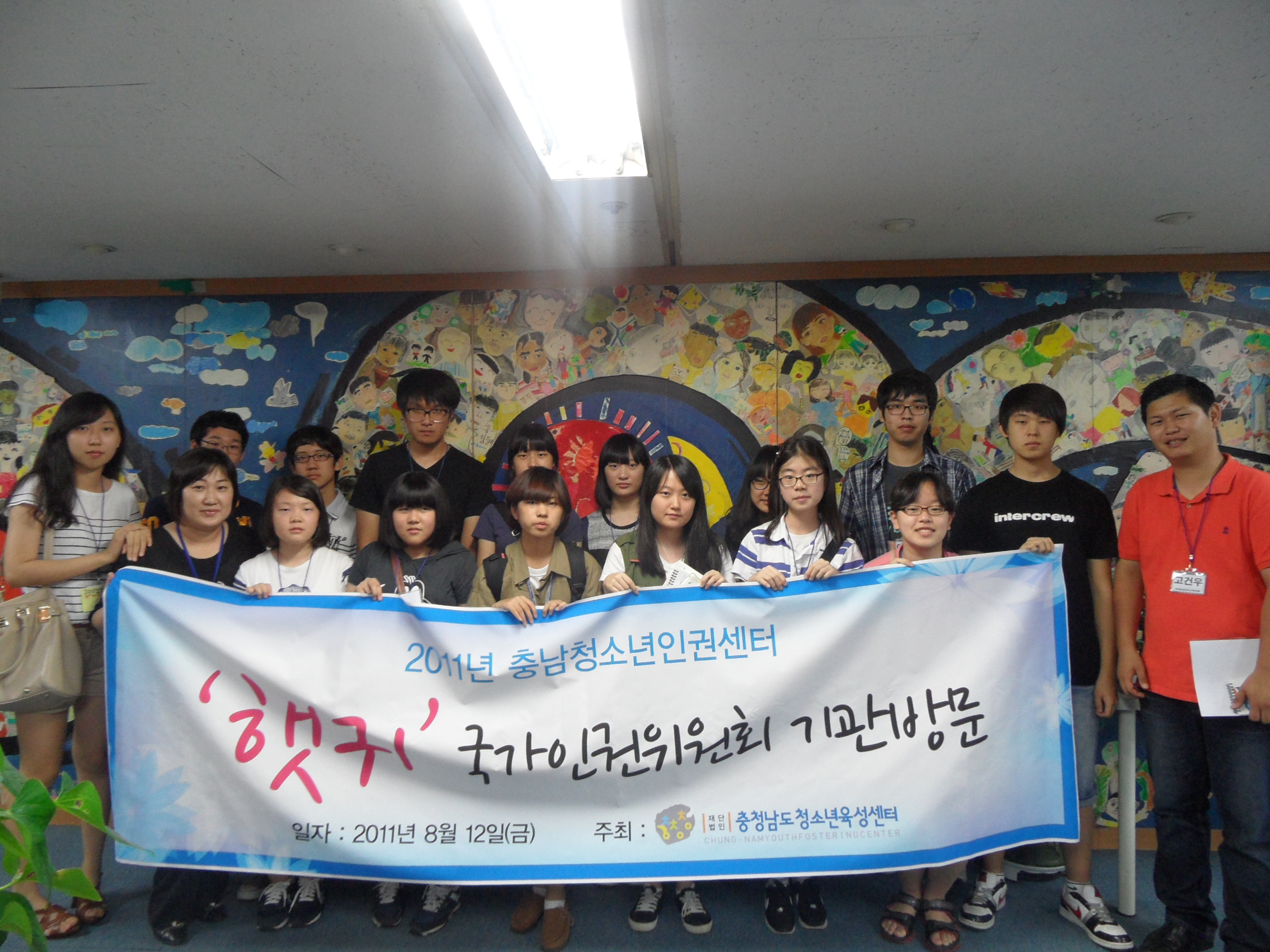 "햇귀"국가인권위원회 기관방문 (2011.8.12.) 3193 | 최고관리자 | 2011-08-17 충남청소년인권센터 "햇귀" 회원들이 국가인권위원회기관방문을 하였습니다.국가인권위원회의 역할과 기능, 인권교육, 인권자료실, 인권센터등을 견학하였습니다.