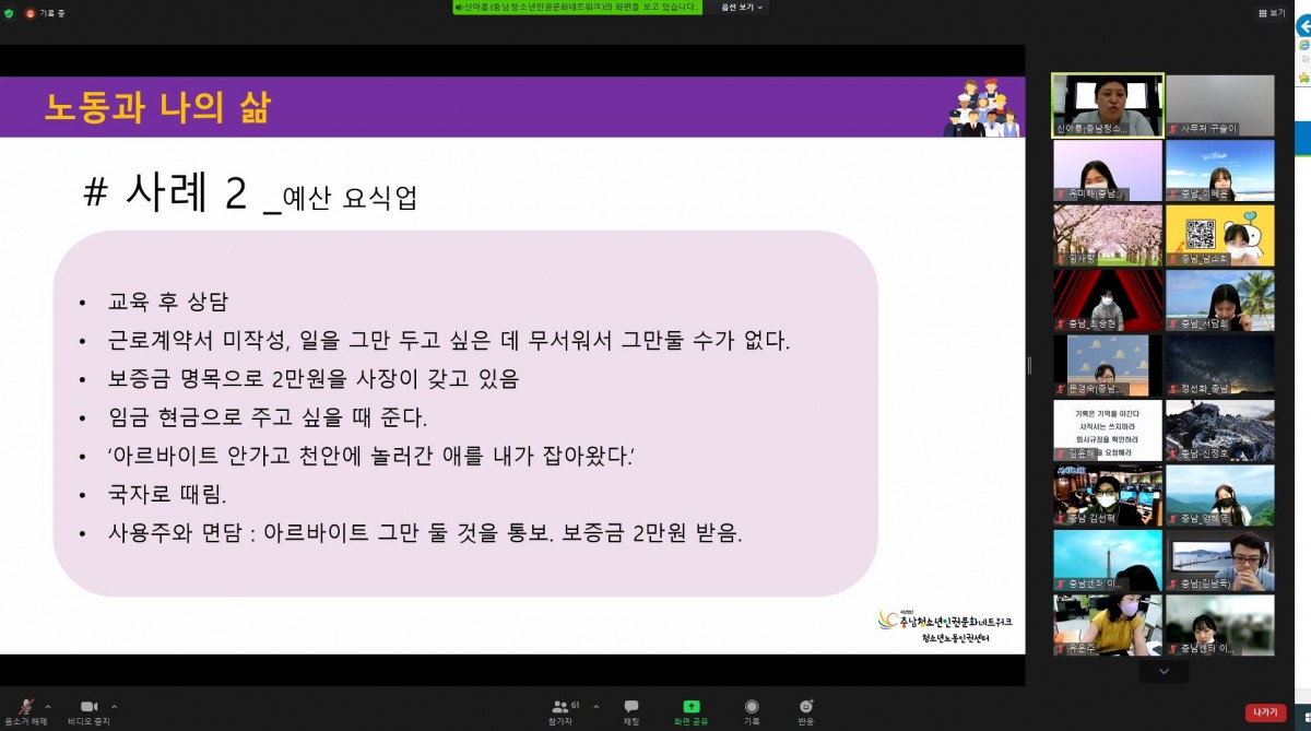 2021년 2차 인권교육 실시 1376 | 충남청소년진흥원 | 2021-12-16 1. 일 시: 2021.08.23(월) 13:00~17:002. 제 목: 1부: 직장내괴롭힘, 2부: 청소년노동인권3. 내 용: 청소년 유관기관으로써 청소년 노동인권에 대한 감수성을 깨우고, 갑질없는 상호 존중과 배려의 조직문화 조성을 위한 교육4. 강 사: 1부: 오진호(직장갑질119 집행위원장) 2부: 신아롱((사)충남청소년인권문화네트워크 교육국장)