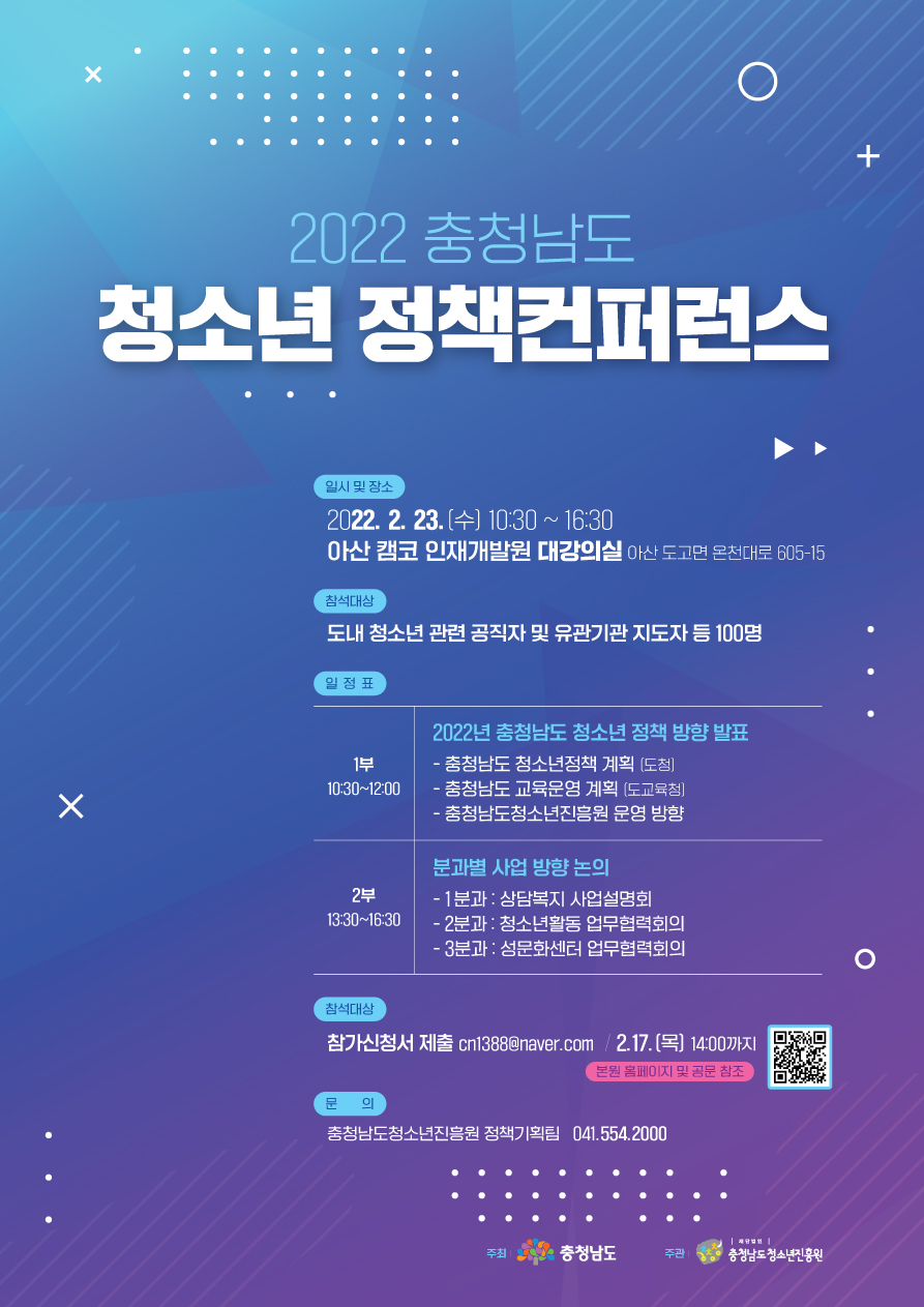 (재)충청남도청소년진흥원(원장 박영의) 에서는 오는 2월 23일(수) 10:30 아산 캠코 인재개발원에서 ‘충청남도 청소년 정책컨퍼런스’를 진행한다고 밝혔다.