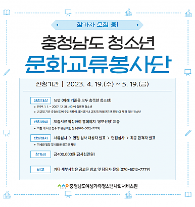 충청남도 청소년 문화교류봉사단 참가자 모집