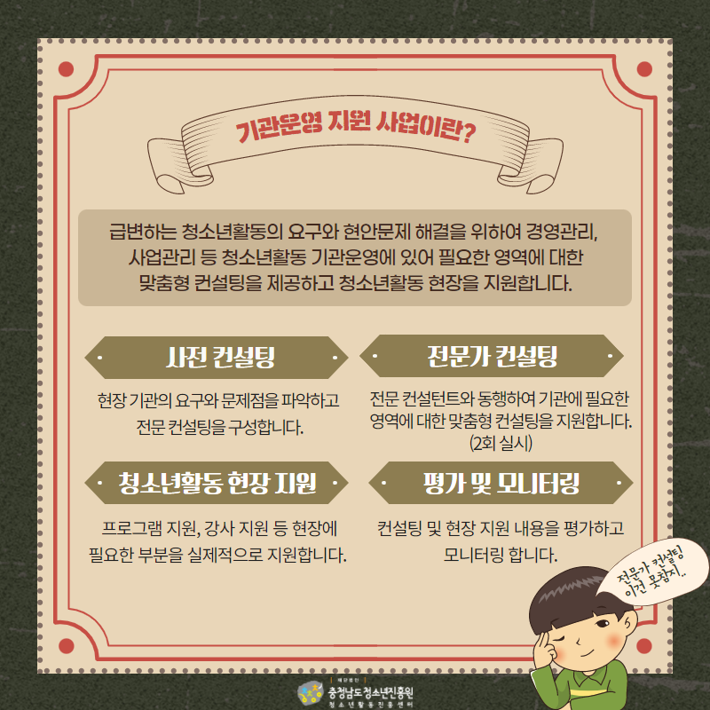 기관별 맞춤형 서비스를 지원해드리고자 청소년활동 기관운영 지원 사업 참여기관을 모집하오니