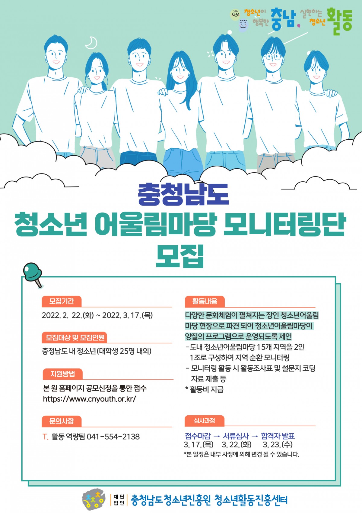 [공고]충청남도 청소년어울림마당 모니터링단 모집 대상 2022. 2. 22.(화) 분야 300 교육기간 2022. 2. 22.(화) ~ 2022. 3. 17.(목) 접수기간 2022. 2. 22.(화) ~ 2022. 3. 17.(목) 장소 ON 교육비 2022. 3. 17.(목) 정원 300 상태 모집 2022.02.22 11:25 [붙임] 충청남도 청소년어울림마당 모니터링단 모집 공고.pdf (160.6K) + 98 2022.03.14 09:39 [별첨1]지원 신청서 양식.hwp (15.5K) + 204 신청 목록 상세내용 (재)충청남도청소년진흥원 활동진흥센터에서는 문화예술, 스포츠 등을 소재로 한 공연, 경연, 전시, 놀이 체험 등 문화체험이 펼쳐지는 장인 청소년어울림마당 현장으로 파견되어 청소년어울림마당이 양질의 프로그램으로 운영되도록 제언하는 「충청남도 청소년어울림마당 모니터링단」을 모집하오니 많은 관심과 참여 바랍니다.