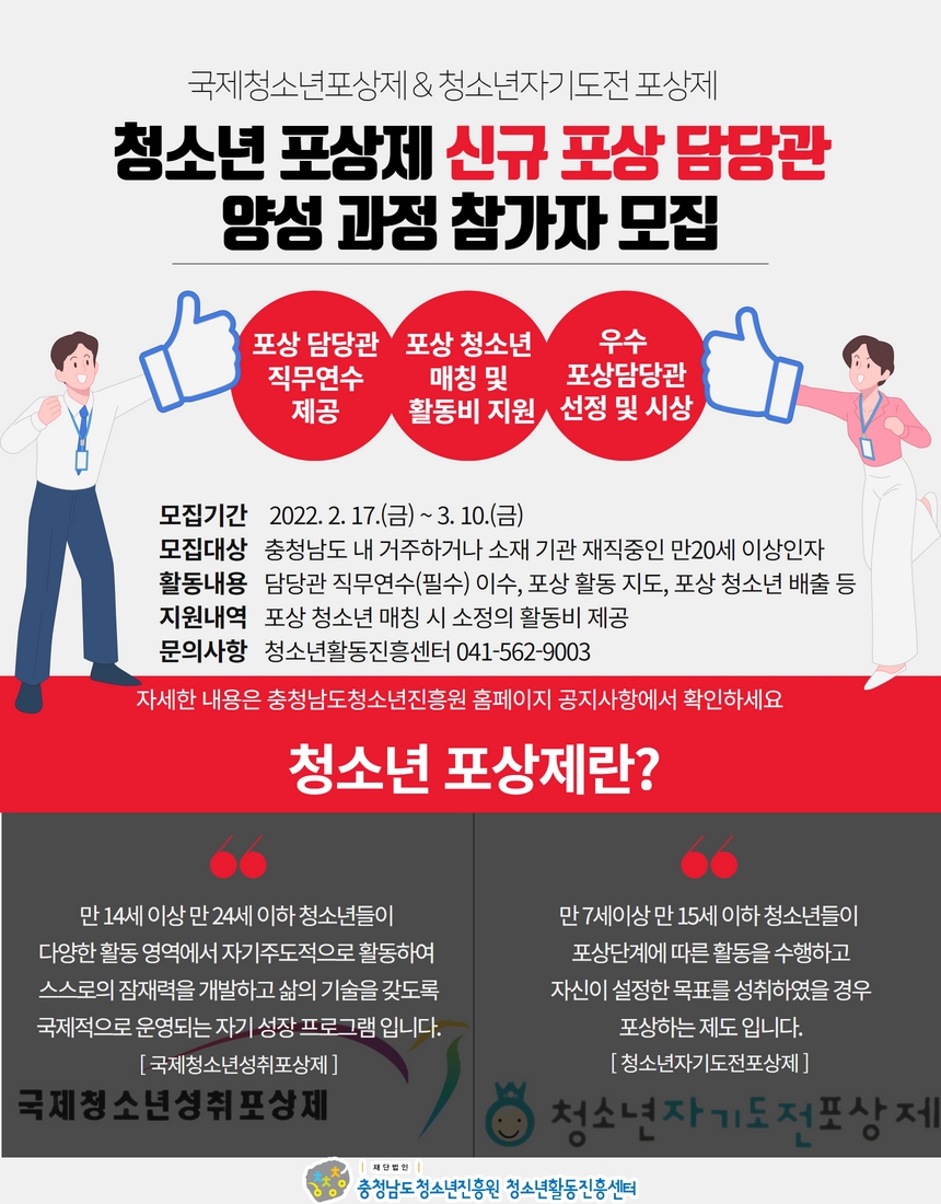 재단법인 충청남도청소년진흥원 활동진흥센터에서는 청소년 포상제 활성화를 위해 신규 포상 담당관 양성과정 참가자를 아래와 같이 모집하오니