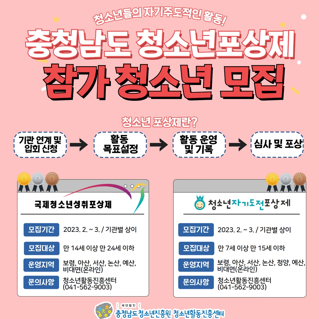 재단법인 충청남도청소년진흥원 활동진흥센터에서는 청소년들의 자기주도적인 성장 프로그램인 청소년 포상제 참가 청소년을 아래와 같이 모집하오니 도내 청소년들의 많은 관심과 참여 바랍니다.