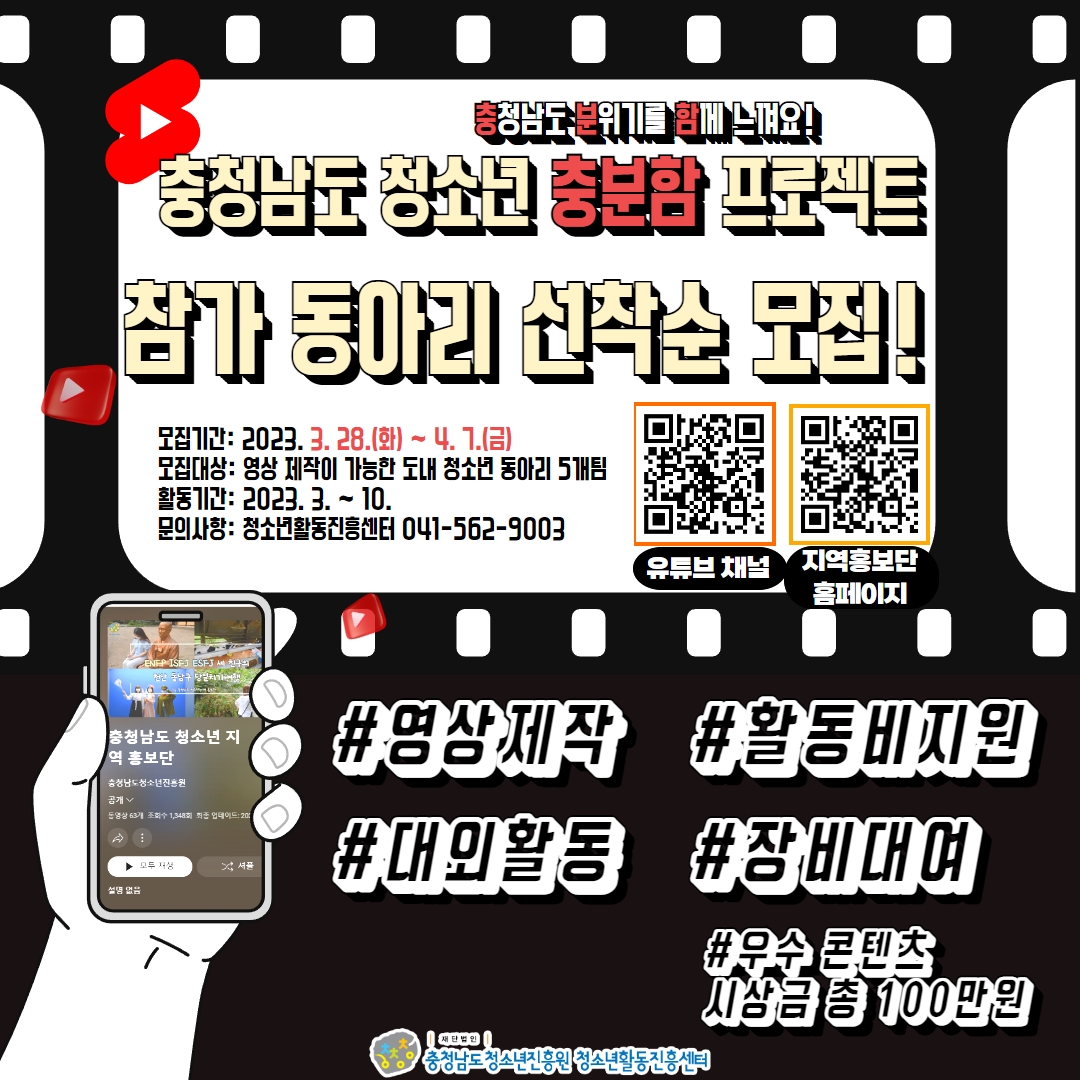 재단법인 충청남도청소년진흥원 활동진흥센터에서는 청소년들의 자기주도적인 활동을 통해 지역사회를 홍보할 수 있는 기회를 마련하고자 아래와 같이 「청소년 충분함 프로젝트」참가 청소년 동아리를 추가 모집하오니