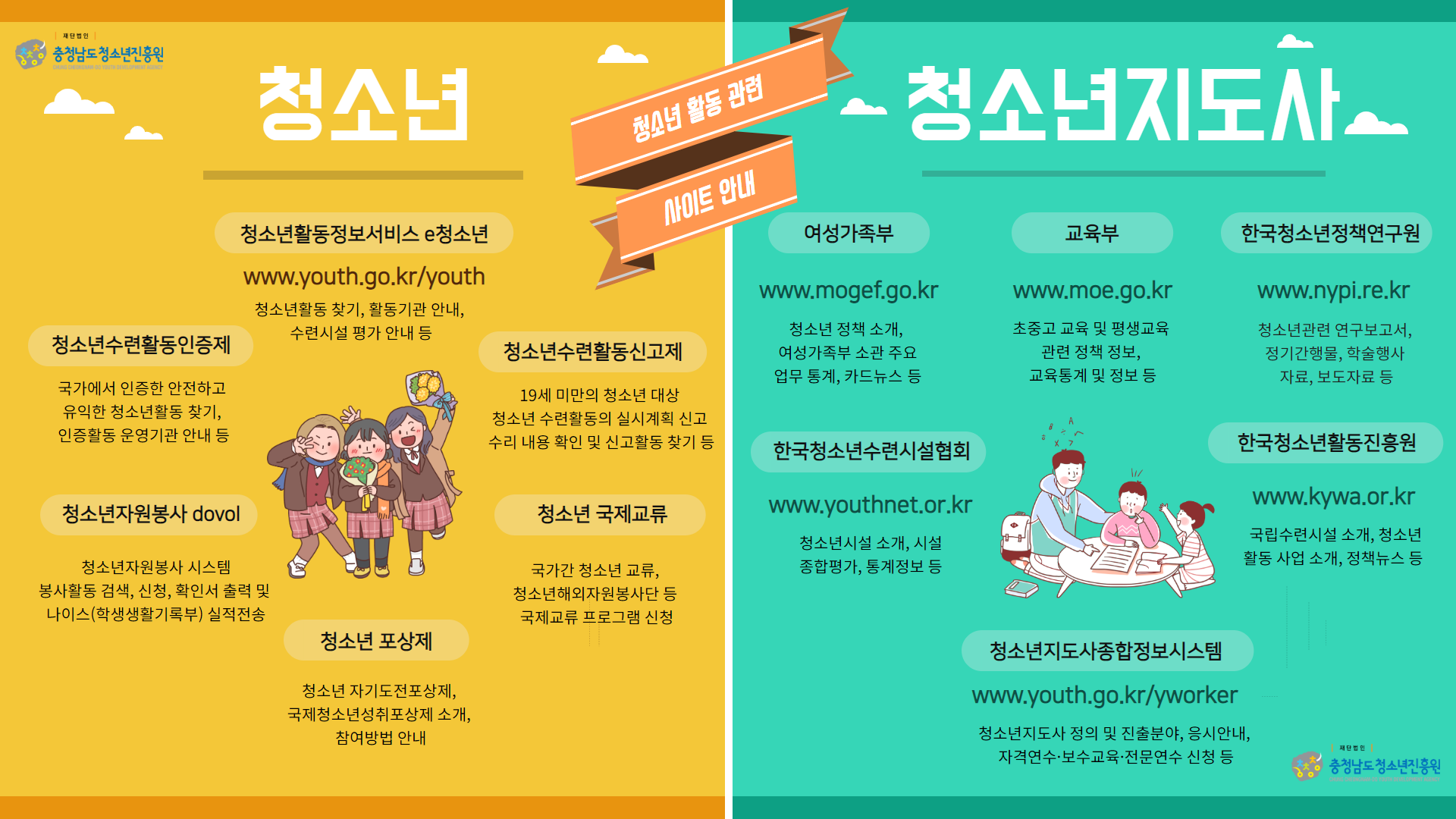 이에 청소년과 청소년지도자 선생님들께서 참고하실만한 관련 사이트들을 안내드리오니 참고하시면 좋을 것 같습니다^^ 각 사이트에서는 다양한 청소년 관련 정책 정보들을 확인 할 수 있습니다.