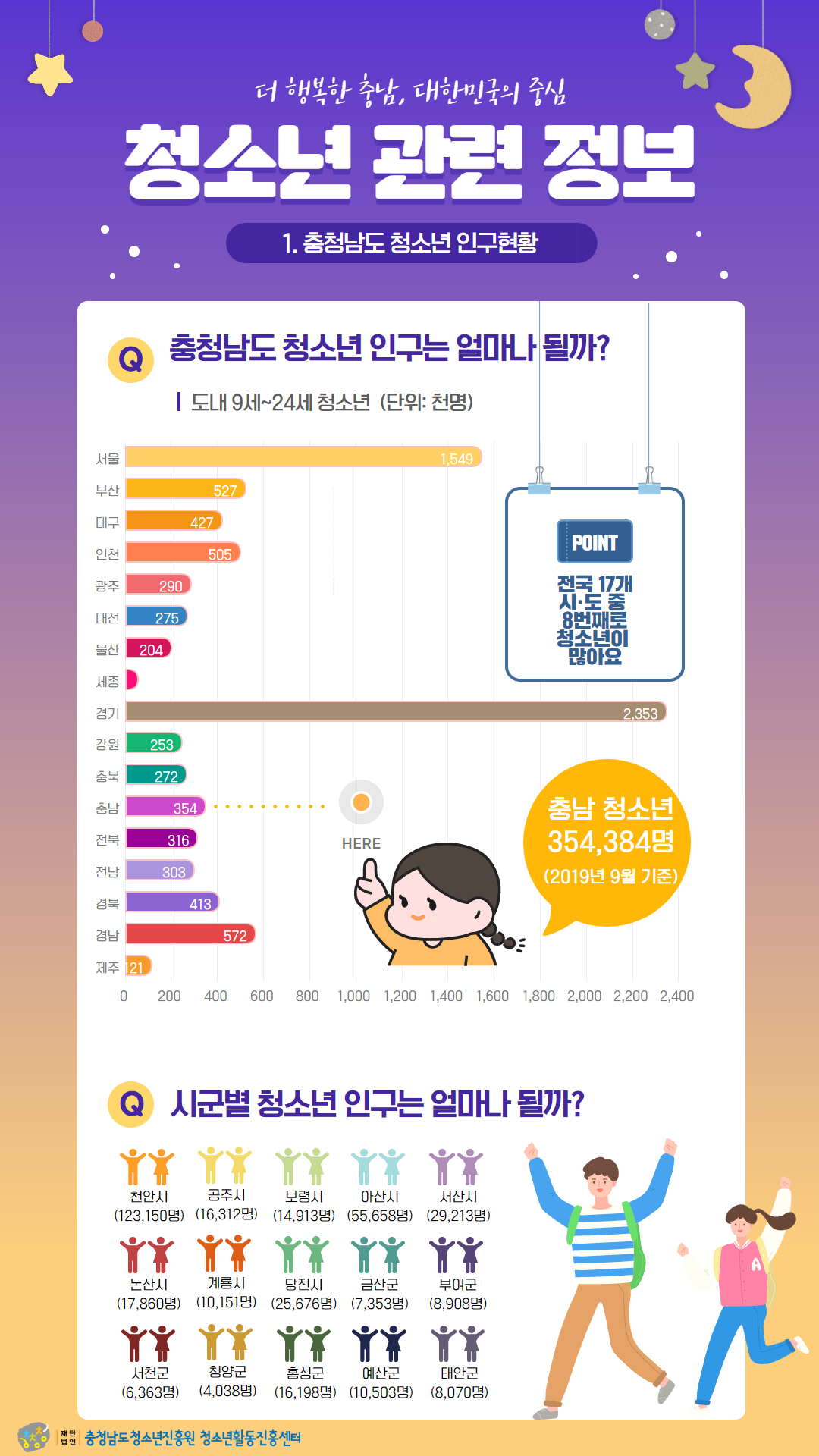 충청남도의 청소년 수는 354,384명으로 17개 광역시·도 중 8번째이며 전국 청소년의 약 4%를 차지하고 있습니다.