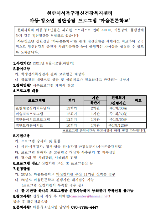 (홍보) 천안시서북구정신건강복지센터 아동·청소년 짐단상담 프로그램 '마음튼튼학교'
