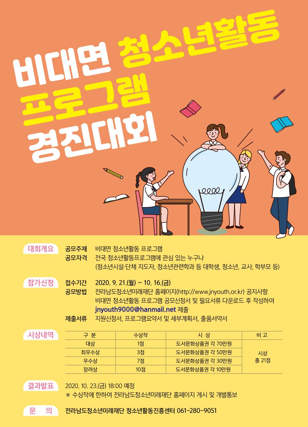 (홍보) 비대면 청소년활동 프로그램 경진대회 안내 2235 | 최고관리자 | 2020-10-14 2020.10.14 16:52 비대면청소년활동프로그램안내및제출서식.hwp (31.5K) + 8 전라남도청소년미래재단 청소년활동진흥센터에서 '비대면 청소년활동 프로그램 경진대회'를 진행한다고 합니다. 비대면 청소년활동 프로그램 경진대회를 통해 청소년현장에서 활용할 수 있는 우수한 비대면 청소년활동 프로그램을 발굴하고 보급하여 코로나 19 이후 변화된 청소년활동에 대비하고, 새로운 패러다임 환경에 적응할 수 있도록 지원하고자 다음과 같이 비대면 청소년활동 프로그램 경진대회를 진행한다고 하니 많은 관심과 참여 부탁드립니다 :)