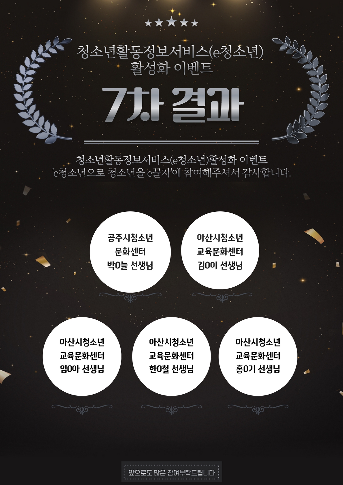 [안내] 청소년활동정보서비스(e청소년) 7차 이벤트 결과 2042 | 활동진흥센터 | 2022-12-06 안녕하세요. 활동진흥센터입니다 !어느덧 마지막 이벤트 결과를 발표하게 되었습니다.선정되신 선생님들께는 개별 연락 드릴예정입니다.그동안 청소년활동정보서비스(e청소년)에 많은 관심 주셔서 감사드리며, 앞으로도 e청소년을 통해 청소년들에게 다양한 정보 제공 부탁드립니다 ! ( •̀ ω •́ )✧남은 연말도 행복하시길 바라고, 눈길 이동 조심하세요.감사합니다.