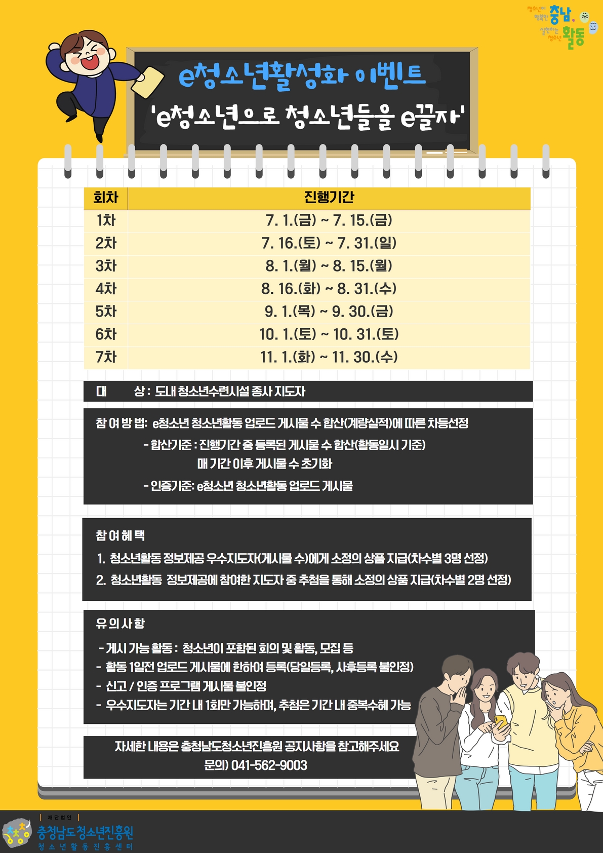본 원에서는 도내 청소년수련시설에 종사하고 계신 지도자를 대상으로 청소년활동정보제공서비스(e청소년) 활성화 이벤트를 진행합니다.