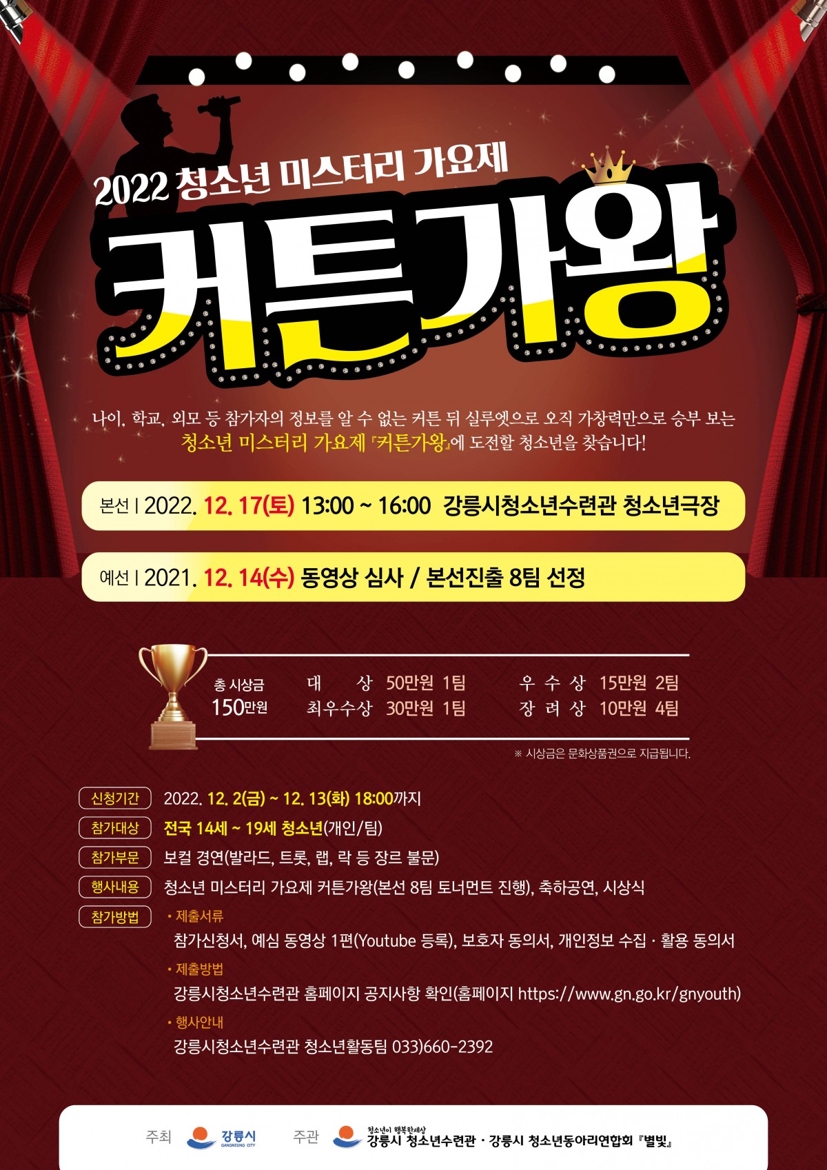 □ 일 시 - 예 선 : 2022. 12. 14(수) '동영상 심사' - 본 선 : 2022. 12. 17(토) 13:00 ~ 16:00 □ 장 소 - 예 선 : 동영상 심사 / 본선진출 8팀 선발 - 본 선 : 강릉시청소년수련관 청소년극장 □ 대 상 : 전국 14세 ~ 19세 청소년 □ 접수기간 : 2022. 12. 2(금) ~ 2022. 12. 13(화) 18:00까지 □ 접수방법 : 이메일 접수 (이메일 주소 jaedol@korea.kr)