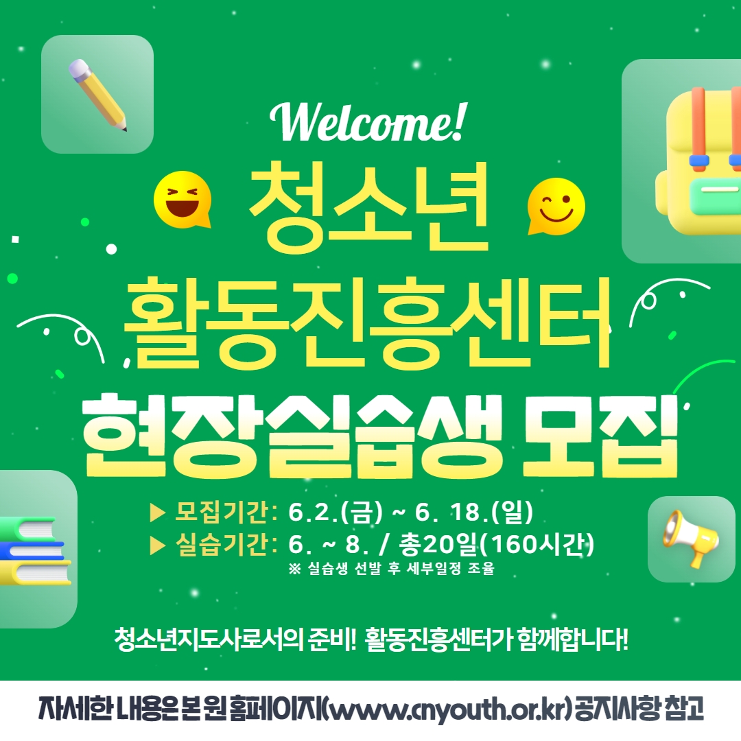 [모집] 2023년 청소년활동진흥센터 현장 실습생 모집 안내 2125 | 활동진흥센터 | 2023-06-02 2023.06.02 10:33 230602-현장 실습생 모집 안내.pdf (275.6K) + 0 2023.06.02 10:33 별첨. 실습 신청서.hwp (20.5K) + 44 청소년활동 현장에 대한 이해와전문성을 갖춘 예비 청소년지도자 양성을 위해 청소년지도사 현장 실습생을 모집하오니 많은 관심과 신청 바랍니다.자세한 내용은 첨부파일을 참고하여 주시기 바랍니다.