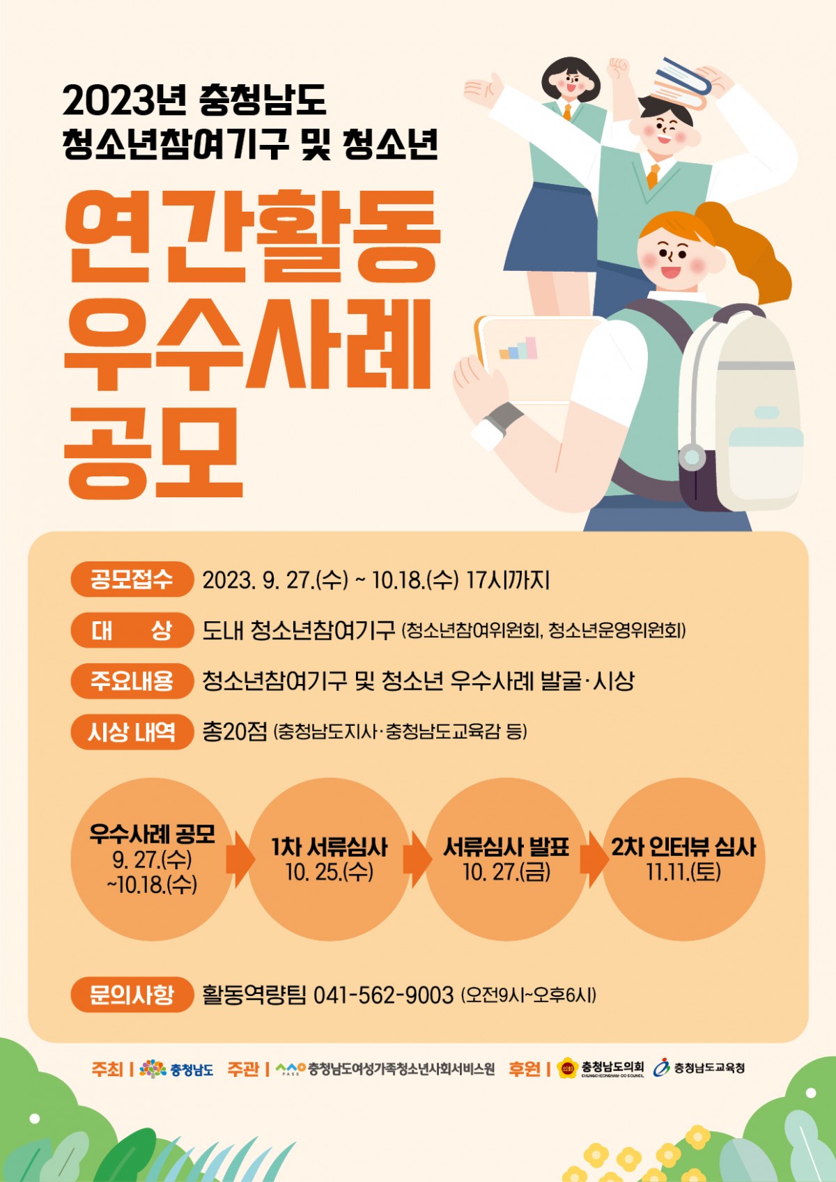 [안내] 2023년 충청남도청소년참여기구 및 청소년 연간활동 우수사례 공모 안내 2645 | 활동진흥센터 | 2023-09-27 2023.09.27 13:46 230927-청소년참여기구 우수사례 공모 안내.pdf (288.7K) + 136 2023.09.27 13:46 별첨1. 개인정보 수집·활용 동의서.hwp (18.0K) + 42 2023.09.27 13:46 별첨2. 참여기구 활동소개서.hwp (19.5K) + 54 2023.09.27 13:46 별첨3. 활동수기.hwp (17.5K) + 60 충청남도여성가족청소년사회서비스원 청소년활동진흥센터에서는 도내 우수 청소년참여기구 및 청소년 발굴·시상을 위한 「2023년 충청남도청소년참여기구 및 청소년 연간활동 우수사례」를 공모하오니 도내 청소년 및 지도자의 많은 관심과 참여 바랍니다.