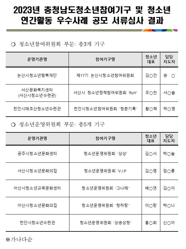 [안내] 2023년 충청남도청소년참여기구 및 청소년 연간활동 우수사례 서류심사 결과 및 인터뷰 심사 안내