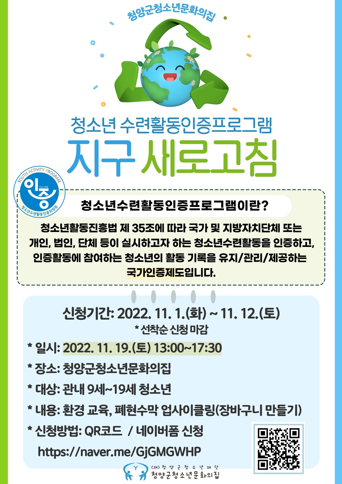 [청양군청소년믄화의집] 수련활동인증 프로그램 "지구 새로고침" 1248 | 활동진흥센터 | 2022-11-14 https://www.youth.go.kr/youth/act/actSearch/actSearchDtl.yt?sCrtfcText… + 938 활동일시 2022. 11. 19.(토) 12:00~17:00활동목표 및 상세내용환경교육 및 업사이클링