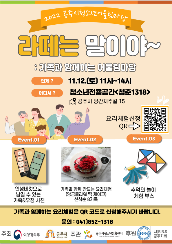 내용 : 가족과 함께하는 요리체험, 인생네컷 사진촬영, 추억의 놀이체험, 마쉬멜로우 굽기 체험 등