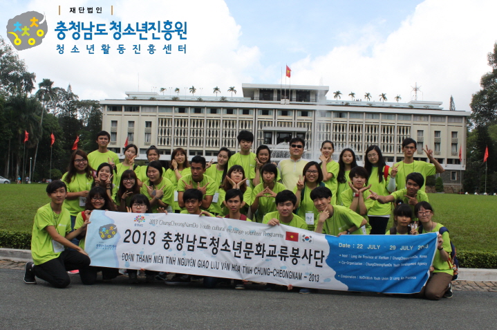 2013년 충청남도청소년문화교류봉사단 귀국 ^^ 4322 | 최고관리자 | 2013-07-30 2013년 충청남도청소년문화교류봉사단이 7박 8일의 일정을 마치고 귀국을 했답니다충청남도청소년문화교류봉사단은 베트남 롱안성의 쩌우탄 고등학교와 삔떰초등학교에서양국 언어배우기, 학교환경개선, 음식만들기 등 다양한 문화교류활동을 펼치고 왔습니다.떠났던 모든 친구들 몸 건강히 돌아와서 정말 다행이구요.베트남에서 느꼈던 따뜻한 정을 오래오래 기억하길 바랍니다