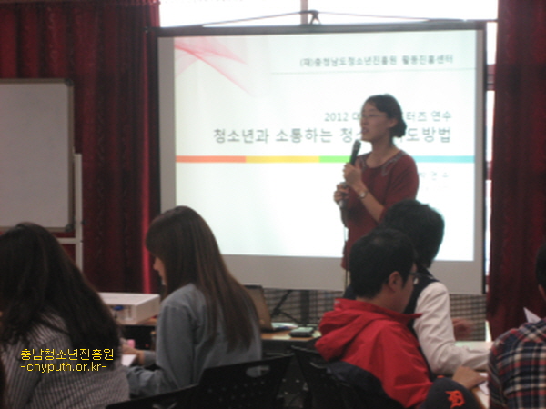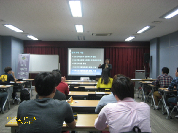 2012대학생서포터즈연수 진행 4622 | 최고관리자 | 2012-10-24 지난 10월 5일(금)~6일(토)/ 1박2일동안천안축구센터에서도내 대학생 34명과 함께 대학생서포터즈연수를 진행하였습니다.지역사회와 연계하는 청소년프로그램, 현장에서 활용할 수 있는 청소년지도방법기타 진흥원소개 및 청소년정책사업에 대한 설명으로 진행되었습니다