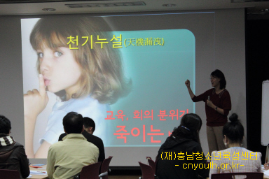 유관기관 실무자 역량강화 연수 3954 | 최고관리자 | 2011-10-21 * 일 시 : 2011년 10월 7일(금)* 장 소 : 천안시두정도서관 다목적홀* 대 상 : 도내 청소년유관기관 실무자* 인 원 : 17명* 내 용 : 청소년과 효율적으로 소통하는 회의방법