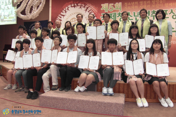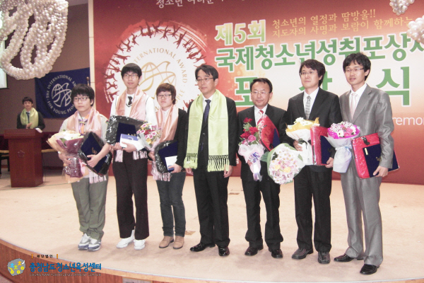 제5회 국제청소년성취포상식 4150 | 최고관리자 | 2011-06-21 제5회 국제청소년성취포상식서 충남도내 우수지도자(여성가족부장관상) 수상 및 청소년(동장) 6명 포상 등 ※사진 설명첫번째,두번째 사진 - 여성가족부 장관상을 수상하는 道 청소년육성센터 활동지원실 김영이 팀장세번째 사진 - 여성가족부장관상을 수상한 청소년육성센터 김영이 팀장(맨 우측)과 논산대건고 한우진 선생님(우측에서 두 번째)네번째 사진 - 제5회 국제청소년성취포상제 동장 포상을 받는 충청남도 청소년(두번째줄 우측 첫 번째 두 번째 첫 번째 줄 좌측 첫번째
