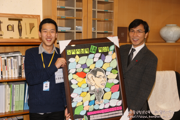 도 청소년참여위는 지난 일년여 동안 다양한 청소년 정책참여 활동을 펼치며, 청소년들이 원하는 도내 청소년 정책에 대한 의견을 모아 안희정 지사를 직접 캐리커쳐로 그려 액자로 준비하고 청소년의 의견 전달 후 청소년과 함께 이야기 나누는 시간을 갖었습니다. 도내 청소들이 바라는 의견은 학교 및 교육뿐만 아니라 사회 전반에 걸쳐 문화, 환경, 교통 등 다양한 방면에서 청소년의 시선에서 바라보는 청소년을 위한 청소년 정책이 필요하다는 것을 알 수 있었습니다.