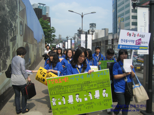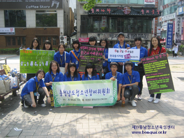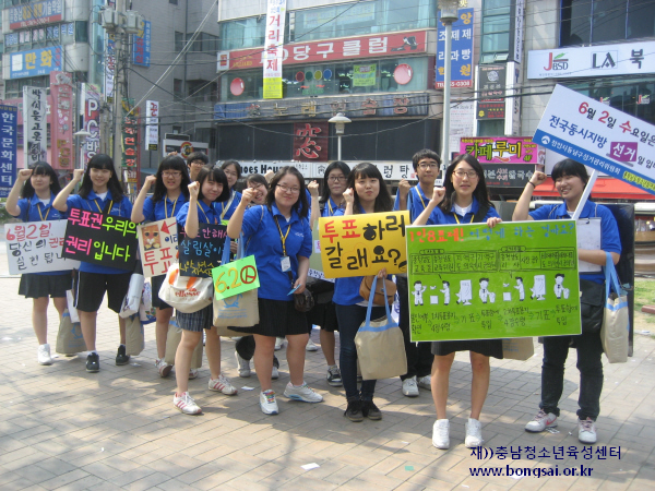 2010년 충청남도청소년참여위원회가 제5회 동시지방선거를 맞이하여 29일(토) 천안시외버스터미널에서부터 천안역까지 투표 참여 독려 및 공명선거를 희망하는 거리 퍼래이드를 하였습니다.
