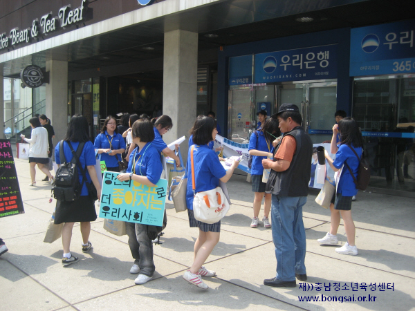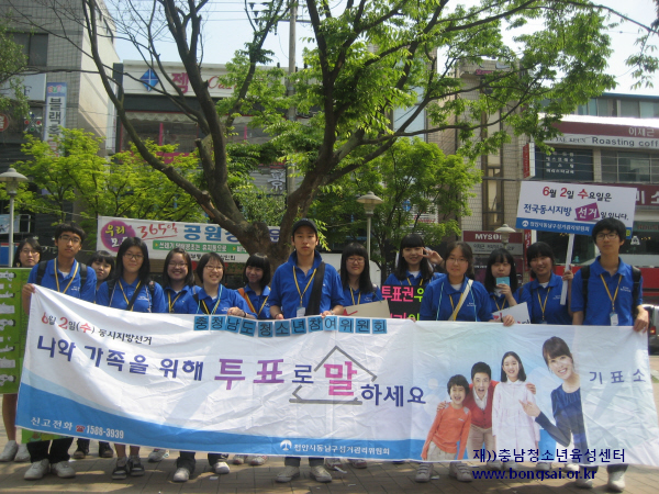 이번 캠페인은 천안시동남구선거관리위원회의 지원을 받아 선거방법과 절차 등을 알리는 홍보물품을 나누어 주며 도 청소년참여위원회 위원들이 직접 제작한 투표 참여를 알리는 참여권과 공명선거를 희망하는 캠페인 문구로 거리 퍼래이드를 하여 그 의미를 더하였습니다.